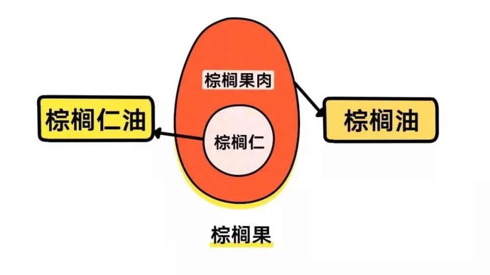 油棕果由外果皮、中果皮(成熟的中果皮又稱果肉)、內(nèi)果皮和果核仁組成,棕櫚油是從油棕果果肉中榨取的油脂,又稱棕油、棕皮油;而由果仁壓榨出的油稱為棕櫚仁(核)油。